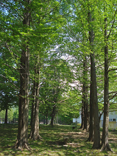 矢ケ崎公園の巨木メタセコイアの新緑をお届けします。